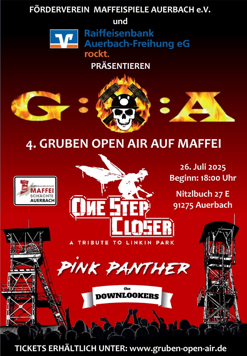 Zusammen mit dem Förderverein Maffeispiele wurden die Planungen für das Gruben Open Air 2022 in Angriff genommen. Um der Veranstaltung noch ein passendes Logo zu verleihen, suchten wir nach Elementen die wir hier verarbeiten konnten. Wir entschieden uns für den Totenkopf als Sinnbild für die aussterbenden Auerbacher Bergleute, Schlägel und Eisen das Symbol des Bergbaus, der Bergwerkshelm für den Bergmann und das Feuer für den Hochofen, in dem das Erz verhüttet wird. Als passionierter Heimwerker wollte Gerhard Raß dieses Logo auch noch zum Leben erwecken.